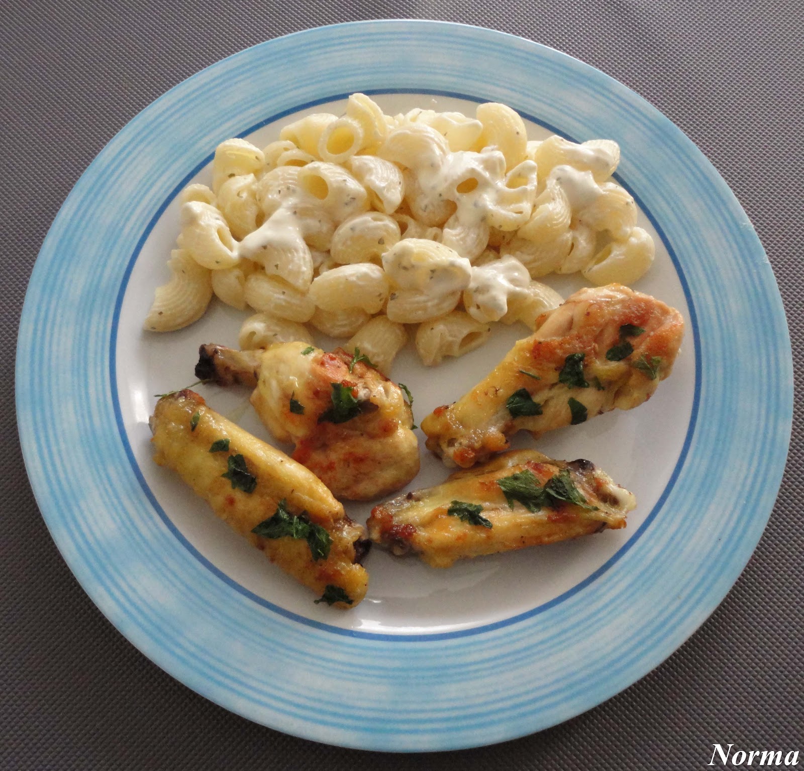 Escurrir la pasta y la ponemos en una fuente le echamos el queso por encima y acompañamos con las alas.
