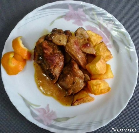 Picar los ajos ya pelados, el perejil y el tomillo, se puede hacer en el mortero y un poquito de sal. Echarlo en la olla y la cascara de la naranja rallada, agregar la carne y el coñac y flambear, agregar el zumo de las dos naranjas y el vaso de agua y el azucar. Cocinar a fuego lento durante 30 minutos más o menos.