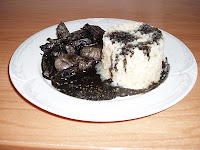 En una olla poner un chorrito de aceite a calentar, pochar 2 dientes de ajo y media cebolla cuando esté hecha añadir el choco cortado en cuadrados, poner la sal y dejar cocer unos 30 m. añadir la tinta del choco cuando esté casi hecho.