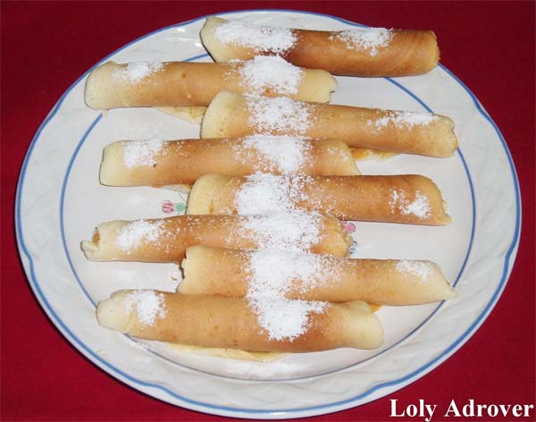 En un cuenco montar la nata con el azúcar y rellenar las crepes, meter en la nevera y a la hora de servir decorar con azúcar molida.