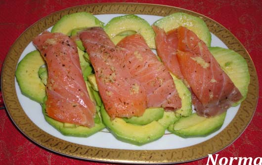 Pelar el aguacate y cortar a la mitad le quitamos la semilla y cortamos en láminas, poner en un plato con el salmón por encima, rociar por encima la vinagreta al gusto.