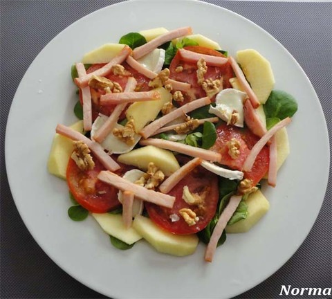 Para montar el plato pongo como base los canónigos, después las rodajas de tomate, unas escamas se sal por encima, los rulos de queso cabra, la manzana pelada y cortada en trozos, las nueces también en trozos y por ultimo cortar el lomo de sajonia en tiras que pasaremos primero por la plancha con un poquito de aceite para darle la plato ese contraste templado. Poner por encima.
