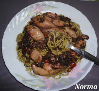 Escurrir la pasta y poner en una fuente con los chipirones por encima.