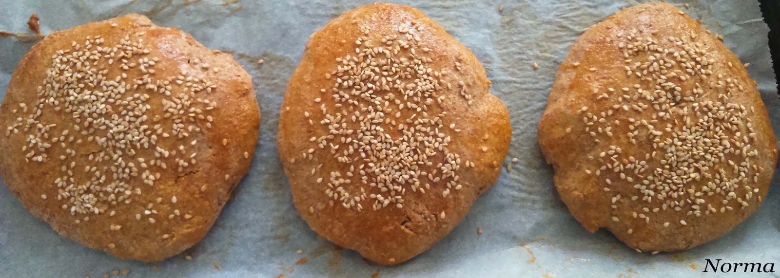 Batir la yema de huevo y con un pincel pintar los panecillos y por encima espolvorear el sésamo, meterlos en el horno unos 25 minutos con calor arriba y abajo.