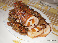 Abrir el lomo, para rellenar poner una fila de ciruelas, otra de orejones, otra de ciruelas y otra de orejones, enroscar y atar con hilo de asar.