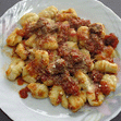 Poner en el fuego una olla grandecita con agua, un chorrillo de aceite y sal, cuando esté en ebullición poner los ñoquis, cuando empiecen a flotar ir sacándolos con la espumadera para un colador de pasta, tener una fuente con algo de salsa anteriormente echa e ir incorporando los ñoquis, Una vez terminado se le echa más salsa con carne. Servir y el queso a gusto de cada uno.