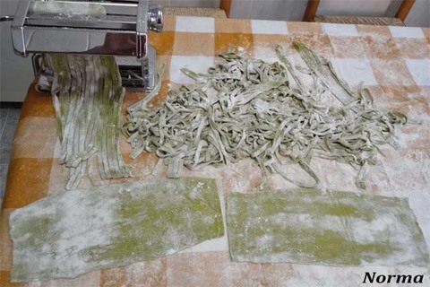 Una vez todo pronto y transcurrido el tiempo de reposo de la masa, coger de a trocitos pequeños de masa y los estiramos un poco con el rodillo y después por la maquina estirándola hasta obtener las láminas del grosor que deseamos, si las láminas son para lasañas las dejamos estiradas del tamaño que deseamos sobre el mantel harinado y si queremos hacer tallarines pasamos a cortarlos y espolvoreamos con  harina.