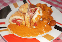 Rellenar las pechugas por el lado frito con queso y jamón york, panceta, aceitunas picadas y pimiento morrón, rellenar y atar con hilo de cocinar. Pasar vuelta y vuelta por la sartén, colocar en una bandeja del horno y agregar el sofrito con un poquito de agua, poner por encima la manzana en trozos, dejar hacer.