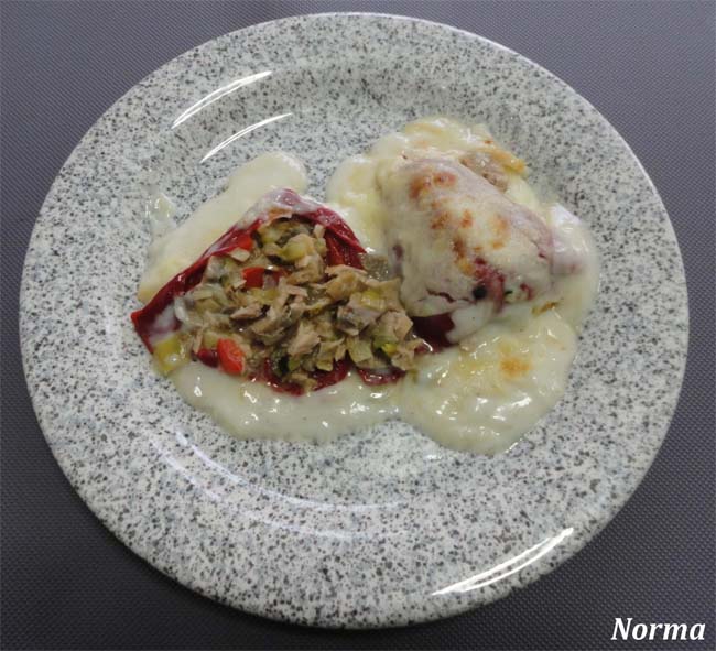 Mientras abrimos las latas de las conservas los pimientos los ponemos en un plato y el atún en un colador fino a escurrir el agua y hacemos la bechamel, poner una olla al fuego con la leche, una pizca de sal, un chorrillo de aceite y nuez moscada, en una taza poner el almidón con un poco de leche mezclar bien y agregamos a la leche. Revolver hasta que empiece su ebullición, apagar fuego.