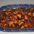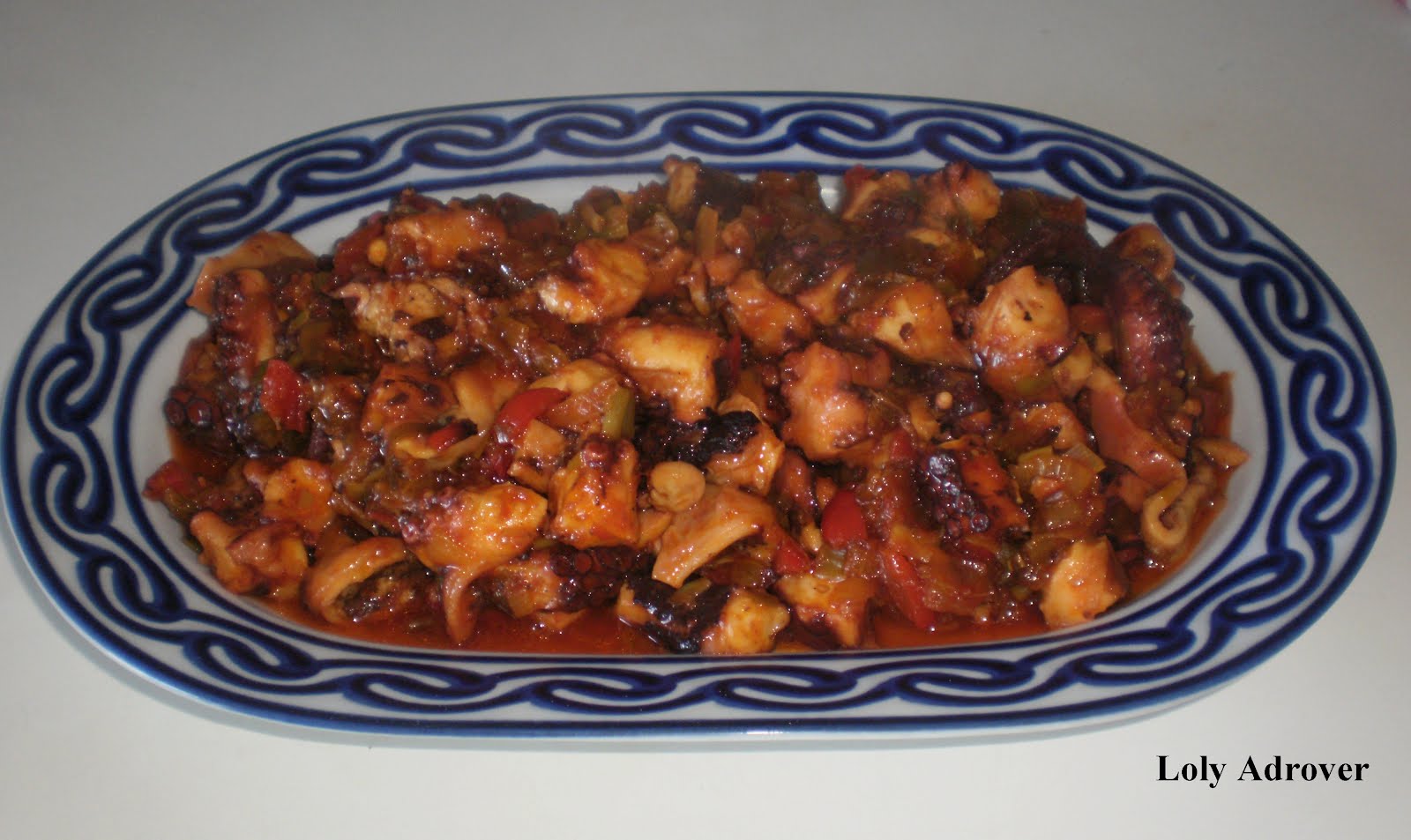 En una sartén con aceite, sofreír los ajos muy picados y la cebolla, cuando esté echa añadir los pimientos también picados, después el perejil y el tomate troceado, la pimienta, el orégano y sal. Cuando esté listo el sofrito mezclar con el pulpo y dejar al fuego unos minutos.