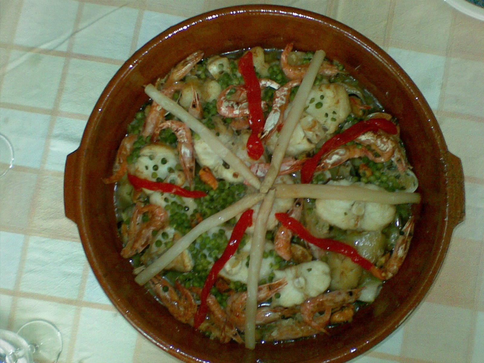Encima añadimos el pescado, el sofrito, los guisantes y las gambas. Después agregamos el vino y añadimos el caldo de pescado y lo ponemos a cocer, rectificamos de sal.