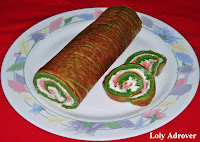 Cortar los bordes y enrollar en caliente, dejar enfriar, cuando esté frió desenrollar y untar con el queso (mejor una marca buena) y cubrir con el jamón cocido, enrollar de nuevo con ayuda del papel vegetal y retirar el papel, meter en la nevera para servir frió.