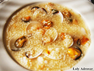 En una tartera con un poco de aceite poner a dorar la cebolla y la zanahoria muy picada, cuando esté echar el caldo antes reservado, cuando rompa a hervir poner la pasta de sopa (también se puede hacer con arroz) cuando esté cocida agregar los mejillones, los langostinos y el rape en trozos pequeños por último añadir las almejas. dejar cocer un momento, (también se puede añadir una pastilla de caldo de pescado) rectificar de sal y lista para comer.