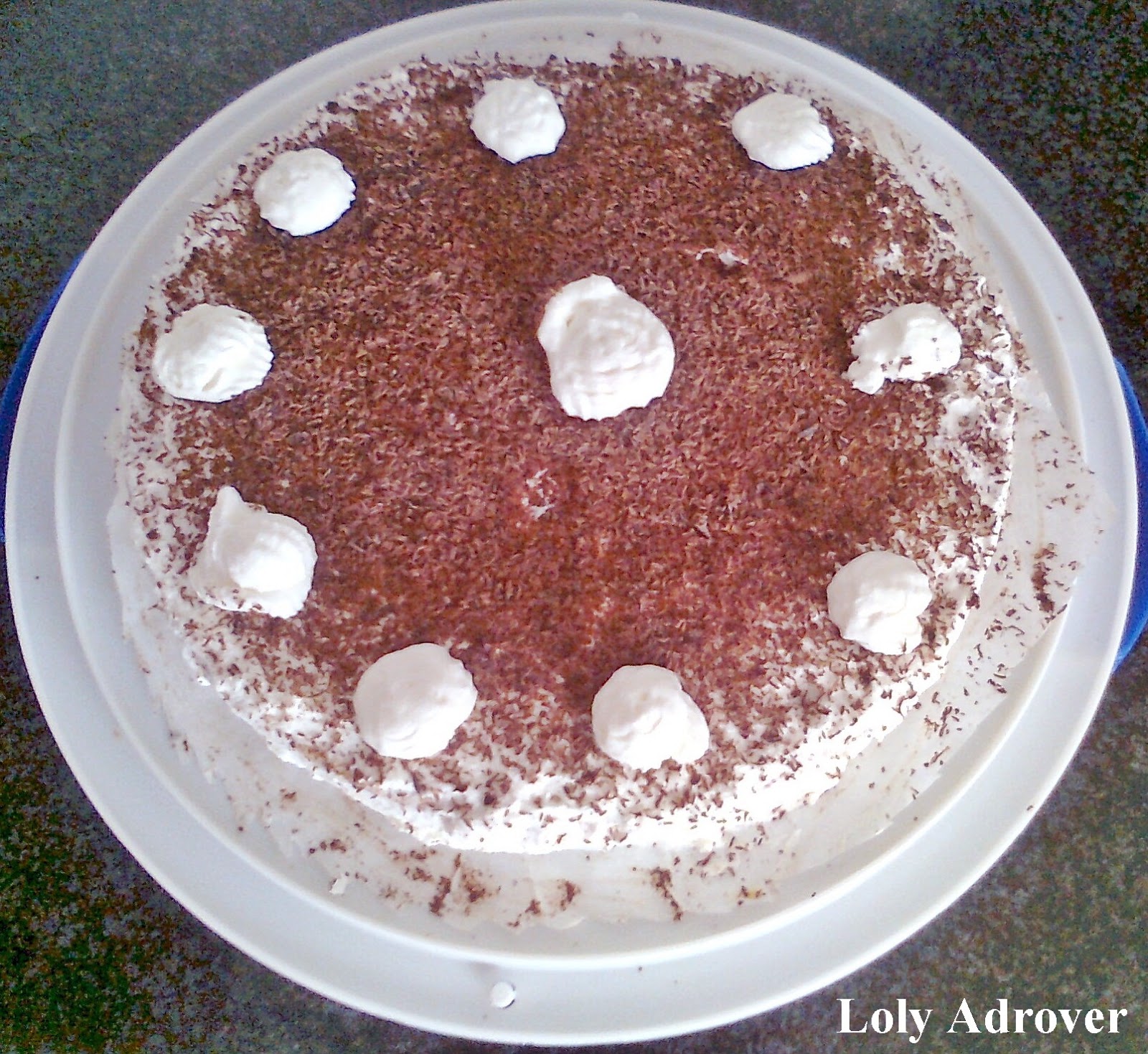 Cuando esté todo frío montar la tarta, cortar el bizcocho por la mitad y emborrachar con el almíbar, poner una parte del bizcocho en una fuente cubrir con la crema, poner la otra parte del bizcocho encima y cubrirlo todo con la nata montada, decorar con el chocolate rallado al gusto.