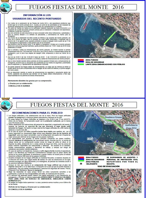 Este luns día 15 de agosto rematan as Festas do Monte 2016 coa tirada dos fogos de lucería no Porto da Guarda á medianoite. Dende o Concello achéganse unha serie de recomendacións a ter en conta ese día, tanto para o público en xeral como para os usuarios do Porto.