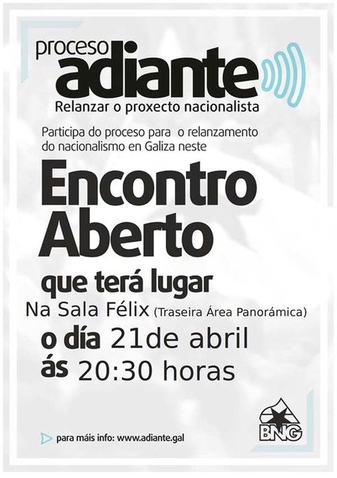 O Proceso Adiante nace do acordo da XV Asemblea Nacional do BNG de iniciar un proceso de refundación do Bloque Nacionalista Galego. Pretende incorporar homes e mulleres que, sen militaren na organización, comparten connosco a necesidade de que exista na Galiza unha expresión política propia nacionalista.
