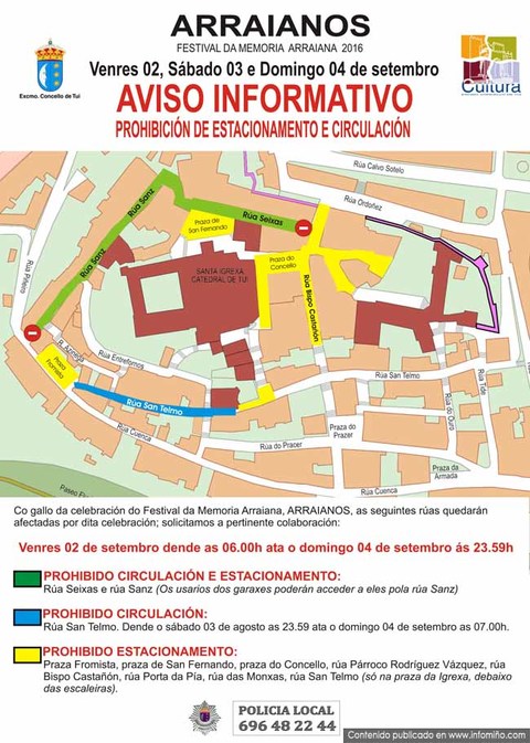 Debido á celebración do "Festival da Memoria Arraiana 2016 - Arraianos", e para garantir a seguridade e o bo desenvolvemento dos eventos que terán lugar na cidade de Tui haberá algunhas restricións no tráfico, tanto no estacionamento coma na circulación durante esta fin de semana.