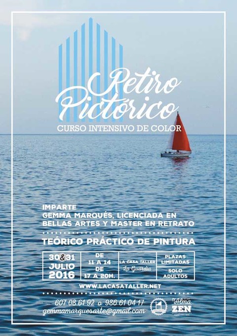 Llega el verano, llega el Retiro Pictórico. Aparca la rutina y vente a disfrutar del olor a mar, las olas, los colores, los pinceles...Gemma Marqués, pintora Licenciada en Bellas Artes y con experiencia docente va a impartir este curso intensivo de fin de semana centrado en la teoría y práctica del color aplicado a la pintura. La Casa Taller va a ser el lugar elegido por su situación privilegiada en el puerto de A Guarda, sus magníficas vistas y su luz natural. Estudiaremos el origen de los pigmentos, haremos gamas de color, pintaremos del natural y compartiremos una experiencia única de relax y retiro.