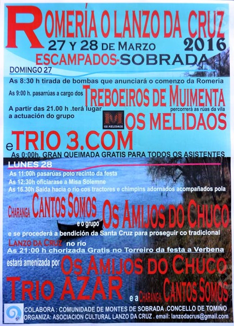 Sábado 26 de Marzo, este día dará comenzo a celebración da Romaríado Lanzo da Cruz no lugar de Escampados da parroquia de Sobrada, no municipio de Tomiño. As 18.00 h os veciños salirán pola parroquia para a recollida da aguardente doada polos veciños para facer a tradicional queimada do día seguinte. A continuación terá lugar a misa de resurrección e finaliza a xornada cunha tirada de bombas.