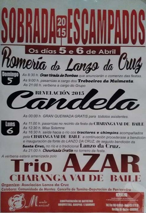 Domingo 5 de Abril, As 8:30 h Gran tirada de bombas que anunciara o comenzó daRomeria, durante toda a jornada un pasarrúasa cargo de los Treboeirosde Muimentapercorreráas ruasda vila. A partir de las 21.00 horas terálugar la actuación do grupo Candela revelación 2015. A medianoitecomo e tradición naRomeriadel Lanzo da Cruz, habrá queimada gratis para todos los asistentes.