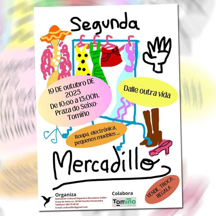 La Praza do Seixo de Tomiño se llenará de vida este domingo 19 de octubre con la celebración del “Segundo Mercadillo”, una cita que apuesta por la economía circular, la reutilización de objetos y la conciencia ambiental. El evento se desarrollará de 10:00 a 15:00 horas y está organizado por la Asociación Cultural Deportiva Recreativa Colibrí, con la colaboración del Concello de Tomiño.