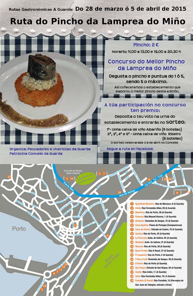 Durante nove días e coincidindo coa celebración da Semana Santa os veciños da Guarda e da comarca e, como non, os visitantes e turistas poderán degustar do pincho da Lamprea do Miño de 11.00 a 13.30 horas e de 19.00 a 20.30 horas. Nesta segunda edición participarán 18 restaurantes e bares da Guarda e como novidade tamén participa un do Rosal que ofrecerán o pincho da Lamprea do Miño a un prezo único de 2 €.