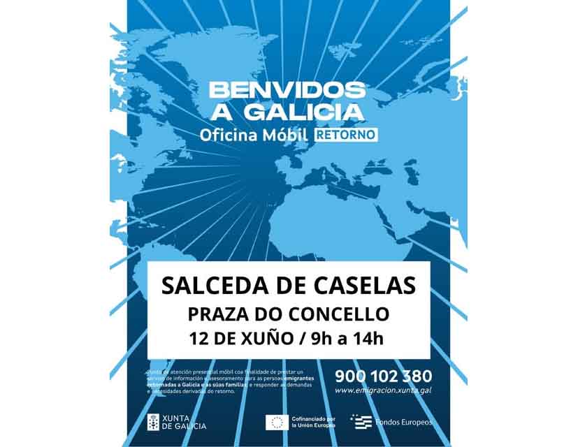 El próximo jueves 12 de junio, el Concello de Salceda de Caselas será escenario de una jornada clave para los gallegos que regresan del exterior. La 'Oficina Móbil Retorno' de la Xunta de Galicia estará presente en la Praza do Concello desde las 9:00 hasta las 14:00 horas, ofreciendo atención presencial y personalizada a quienes retornan a Galicia, así como a sus familias.
