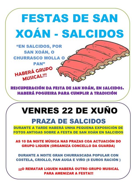 Por segundo ano consecutivo, os veciños de Salcidos, na busca de recuperar as tradicións, celebran novamente as Festas de San Xoán na plazoleta do barrio. Despois do éxito e da ilusión despertada este ano volven con maís forza para ofertar un día de ledicia e confraternidade.