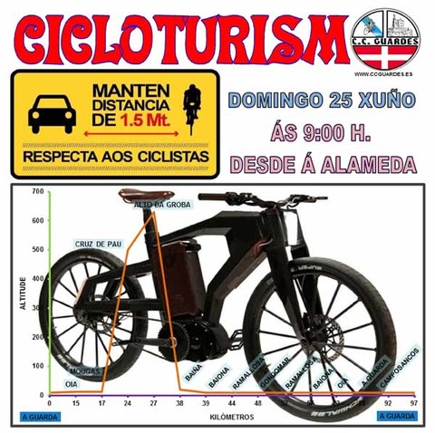 El Club Ciclista Guardés programa una nueva salida este domingo día 25 de junio a las 9:00h desde la Alameda de A Guarda, con una ruta de aproximadamente 97 km que los llevará por parajes como el alto de A Groba o A Ramallosa y Baiona.