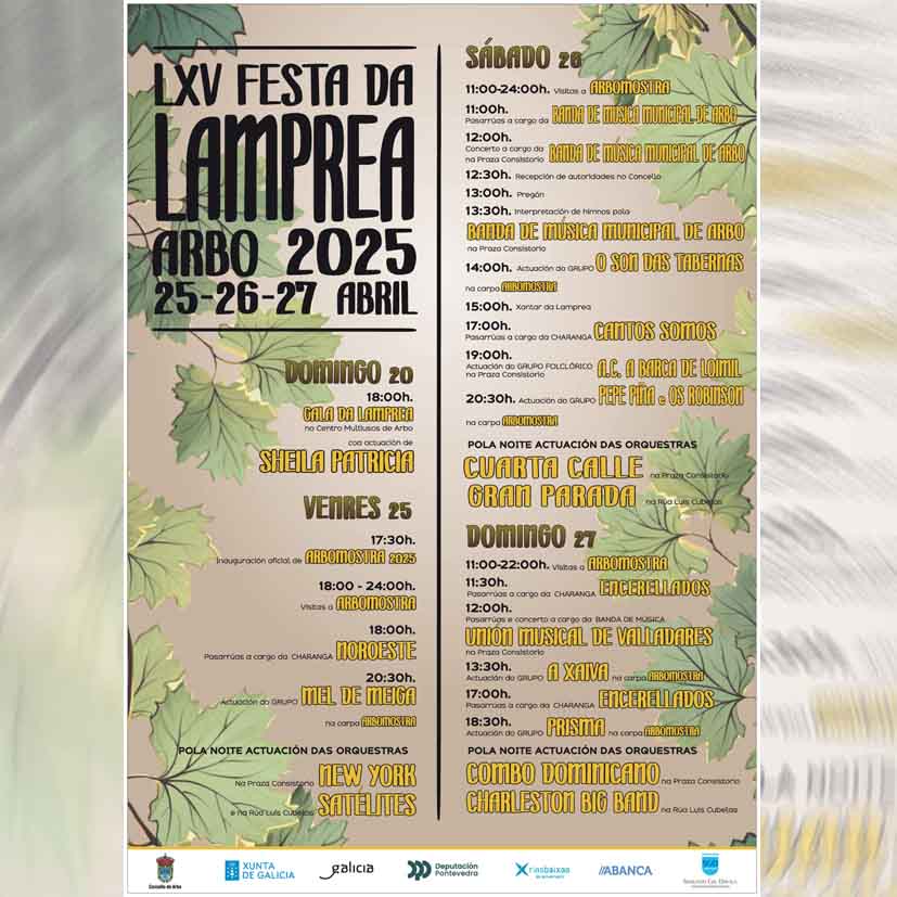 La LXV edición de la Festa da Lamprea se celebrará del 25 al 27 de abril con una potente programación musical y cultural en Arbo, que contará con seis grandes orquestas, charangas, actividades familiares, gastronomía, vino y tradición.