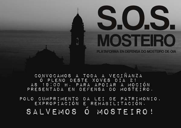 SOS MOSTEIRO, plataforma en defensa do Mosteiro de Oia, formada por veciñas e veciños de Oia, testemuñas do continuo deterioro do cenobio, cansos das mentiras dos propietarios e fartos de ver como se especula co patrimonio cultural, vémonos na obriga de denunciar -ao abeiro do disposto no artigo 5.3 da Lei 5/2016, do 4 de maio, do Patrimonio Cultural de Galicia-, a lamentable situación na que se atopa o Conxunto Histórico Artístico do Mosteiro de Oia.