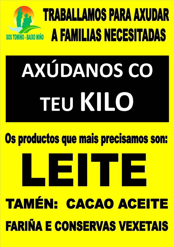 La Asociación Asistencial SOS Tomiño Baixo Miño, va a poner en marcha una campaña de recogida de alimentos, para repartir entre las familias más necesitadas de los concellos de O Rosal, Tomiño y Tui, bajo el lema "Ayúdanos con tu kilo".