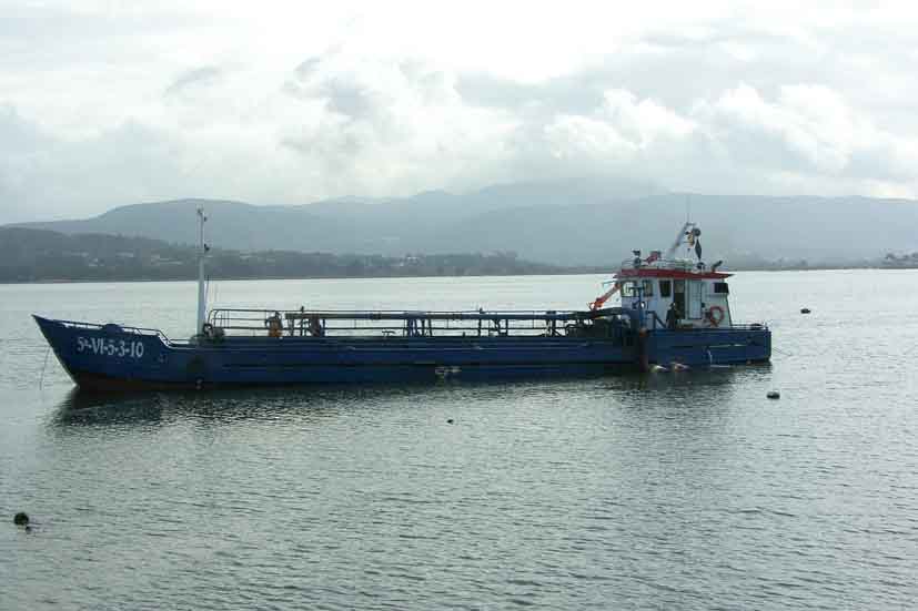 Draga en el Río Miño, durante el dragado llevado a cabo en el mes de noviembre de 2011 para facilitar la navegación del Ferry-Boat que conectaba A Guarda con Caminha.