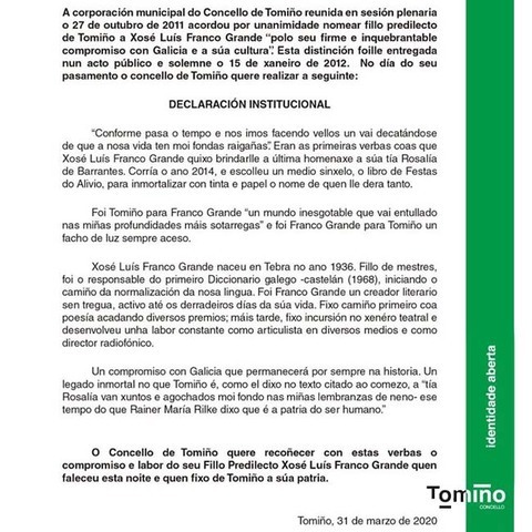 O Goberno local de Tomiño quere recoñecer o compromiso e a importante labor do seu Fillo Predilecto (2012) o escritor e académico Xose Luis Franco Grande, quen faleceu esta noite e quen fixo de Tomiño a súa patria.