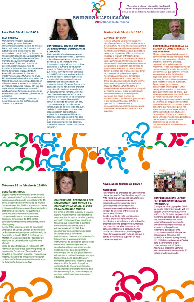 La actividade tendrá lugar entre el 13 y el 16 de febrero en el Auditorio de Goián en horario de tarde.Mar Romera, presidenta de la Asociación Pedagógica Francesco Tonucci, será la encargada de inaugurar las conferencias. Maestra, psicopedagoga y especialista en inteligencia emocional, es autora del modelo "Educar con tres Cs: capacidades, competencias e corazón", así como diversos libros dedicados a la escuela, a la infancia y a la didáctica activa.