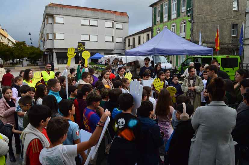 El alumnado del CEP Pedro Caselles Beltrán y el grupo Voces Novas realizaron una acción simbólica en la Praza do Seixo para concienciar sobre la seguridad vial y la movilidad sostenible, recordando que las calles y carreteras de las parroquias también son
