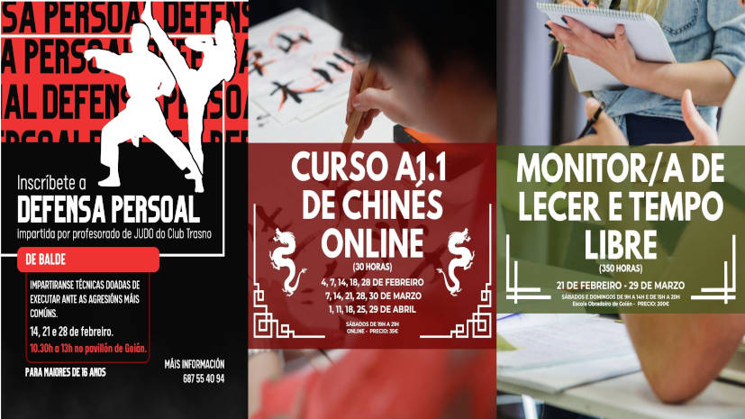 Completa esta oferta el curso de defensa personal, organizado por la Concellería de Deportes e impartido por el profesorado de judo del Club Trasno. Dirigido a mayores de 16 años, se enseñarán técnicas sencillas y prácticas para responder ante situaciones de agresión más comunes. Las sesiones se celebrarán los días 14, 21 y 28 de febrero en el pabellón de Goián, de 10:30 a 13:00 horas, y serán totalmente gratuitas, con inscripciones abiertas en la web del Concello.