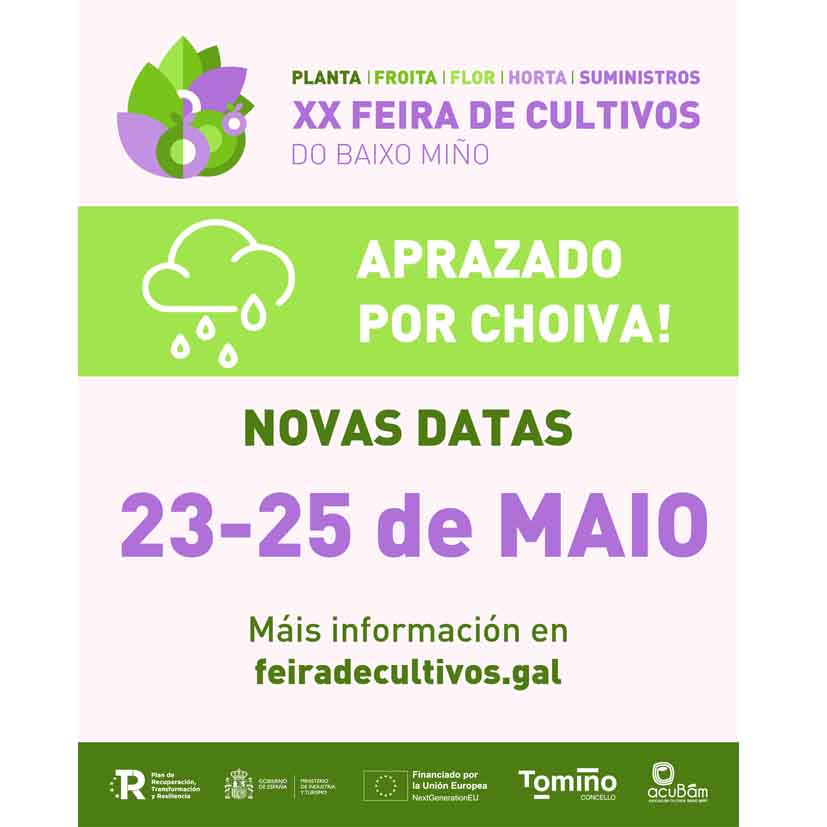 La XX Feira de Cultivos do Baixo Miño aplaza su celebración debido a la previsión de lluvias y condiciones meteorológicas adversas previstas para los próximos días. Sin embargo, el evento no pierde fuerza ni contenido: se celebrará con la misma programación del 23 al 25 de mayo en la Praza Pintor Antonio Fernández de Goián, como estaba inicialmente previsto.