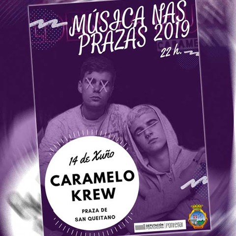 Os encargados de abrir a programación de Música nas Prazas é o grupo de Rap guardés Caramelo Krew, un grupo formado por Hugx (Hugo Aldea) e Holden (Jose Mauri), que encherán de música a Praza de San Queitano dende as 22:00h do venres 14 de xuño.