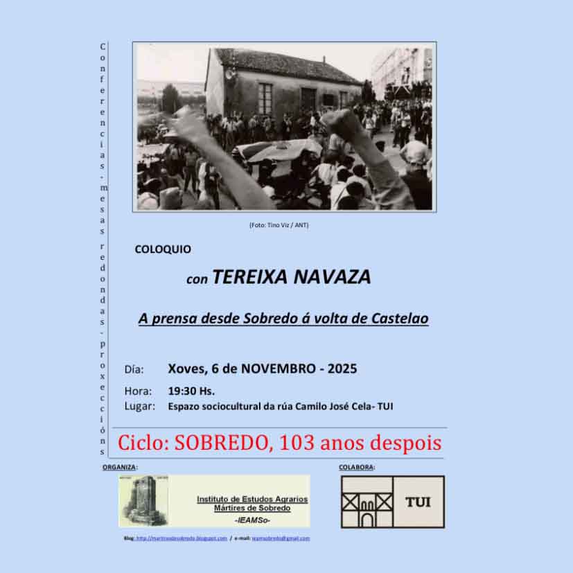 El Instituto de Estudos Agrarios Mártires de Sobredo (IEAMSo), en el marco del Mes da Memoria promovido por el Concello de Tui, organiza este jueves 6 de noviembre, a las 19.30 horas, un coloquio a cargo de la periodista Tereixa Navaza, que llevará por título “A prensa desde Sobredo á volta de Castelao”.