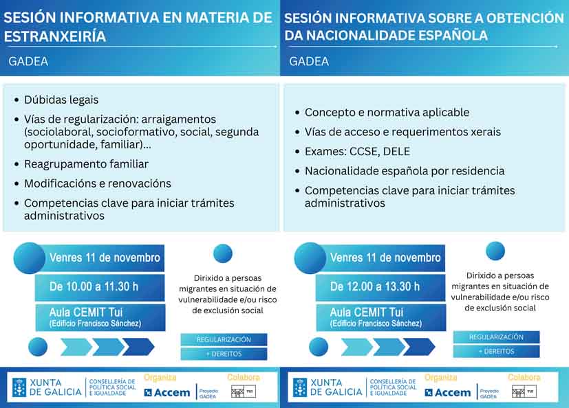 El próximo viernes 7 de noviembre, la asociación Accem impartirá en Tui dos sesiones formativas gratuitas sobre extranjería y obtención de la nacionalidad española. Las actividades se celebrarán en la aula CEMIT del edificio Francisco Sánchez. Plazas limi