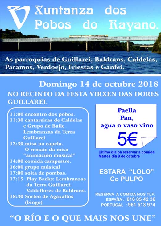O Recinto das Festas da Virxe dos Dores en Guillarei acolle o vindeiro domingo día 14 de outubro a V edición da Xuntanza de Pobos do Rayano, un evento que unirá un ano máis ás parroquias fronteirizas de Guillarei, Baldráns, Caldelas, Paramos, Verdoejo, Friestas e Ganfei.