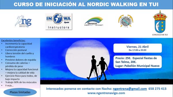 Este venres 21, entre as 17.00 e as 20.00 horas, no pavillón deportivo municipal de Tui, realizarase un curso de iniciación ao Nordic Walking ou Marcha Nórdica. Esta nova modalidade deportiva no noso concello está recollida dentro da Federación Galega de Montañismo, e consiste en camiñar con bastóns, cunha técnica específica.