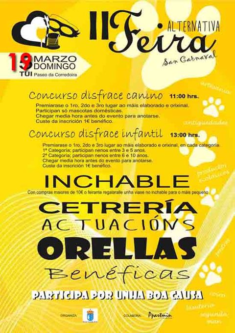 O Paseo da Corredoira de Tui acolle este domingo, 19 de marzo, de 10.30h a 21h a II Feira San Carnaval, que foi adiada o pasado día 5 pola choiva. Está organizada polo Concello de Tui coa colaboración de Ppartmin Creativas con carácter solidario a beneficio de SOS Tomiño Baixo Miño e a protectora de animais de Tui Aloia. Na mesma participarán máis de 80 postos de artesanía, antigüidades, produtos ecolóxicos, sobremesas, coiro, bixutería, segunda man...