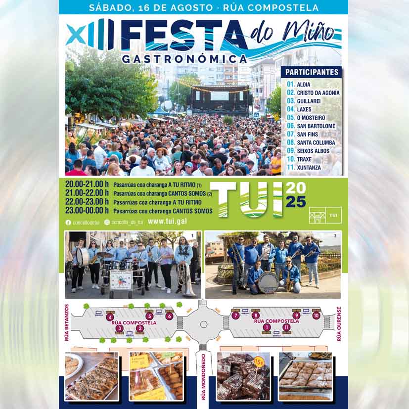 La rúa Compostela de Tui se convertirá este sábado en el epicentro de la gastronomía tradicional con la celebración de la XIII Festa Gastronómica, organizada con la participación de once asociaciones culturales del municipio. El evento comenzará a las 20:00 horas y se prolongará hasta la medianoche, con la previsión de atraer a miles de personas.