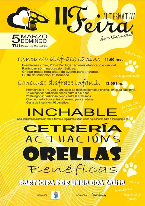 O Paseo da Corredoira de Tui acolle este domingo, 5 de marzo, de 10.30h a 21h a II Feira San Carnaval organizada polo Concello de Tui coa colaboración de Ppartmin Creativas con carácter solidario a beneficio de SOS Tomiño Baixo Miño e a protectora de animais de Tui Aloia. Na mesma participarán máis de 50 postos de artesanía, antigüidades, produtos ecolóxicos, sobremesas, coiro, bixutería, segunda man...