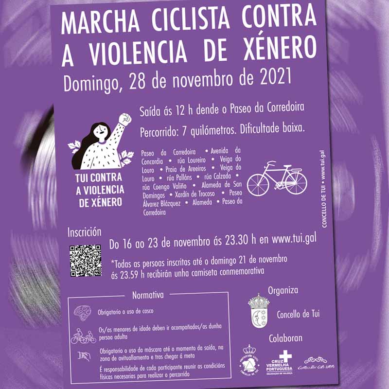 O Concello de Tui, dentro dos actos conmemorativos do 25N, Día Internacional contra a Violencia de Xénero, organiza a Marcha Ciclista contra a Violencia de Xénero 2021. Celebrarase o domingo, 28 de novembro, ás 12 h con saída dende o Paseo da Corredoira. Será un percorrido de 7 quilómetros, de dificultade doada,  que dende o Paseo da Corredoira, irá pola Avenida da Concordia, rúa Loureiro, Veiga do Louro, praia de Areeiros, Veiga do Louro, rúa Palláns, rúa Calzada, Coengo Valiño, Alameda de San Domingos, Xardíns de Troncoso, Paseo Álvarez Blázquez e regresará ao Paseo da Corredoira.