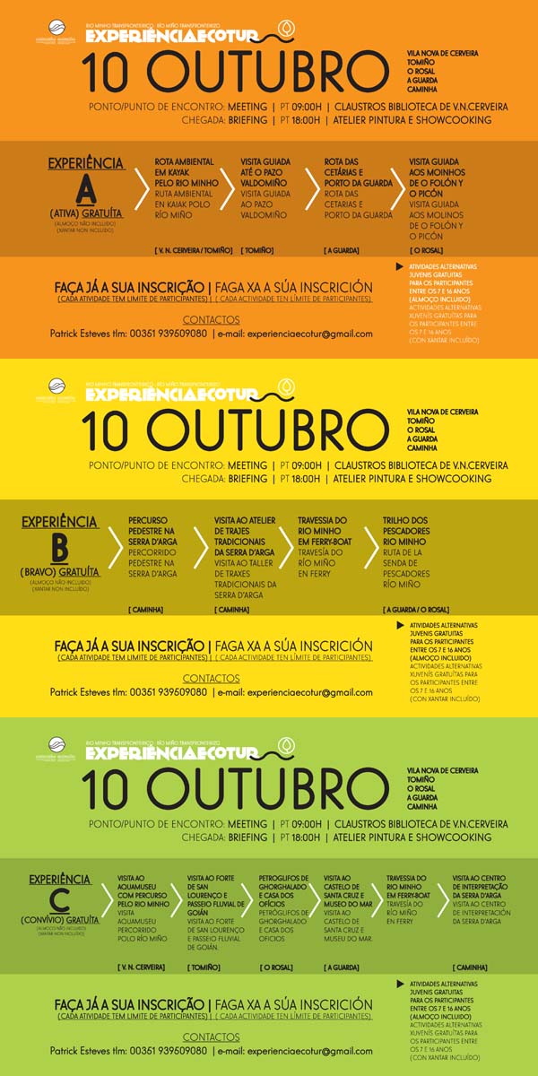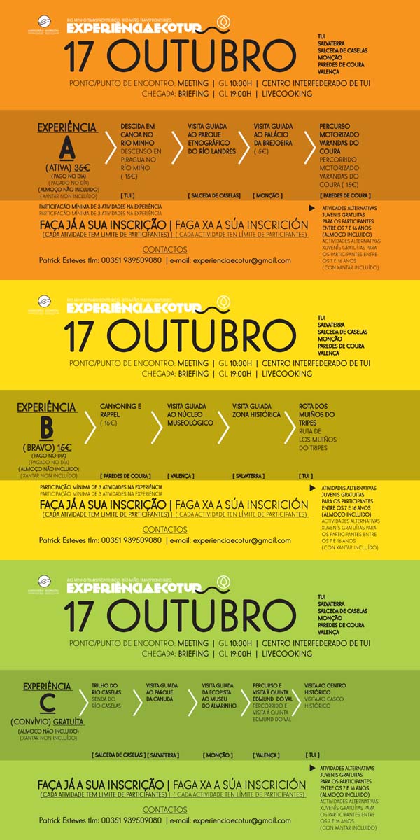 A partir do día 10 de outubro, comezará "Entre a montaña e o río", Experiencias Ecotur, xornadas artelladas como unha viaxe de aventura e descubrimento no ámbito do río Miño transfronteirizo. Baixo o concepto " un destino, dous países", 15 concellos do Baixo Miño e do Val do Miño (Norte de Portugal) articulan tres días de actividades culturais, deportivas e gastronómicas. As Xornadas, orientadas pola Uniminho, transcorrerán os días 10, 17 e 18 de outubro, e son cofinanciadas polo POCTEP.