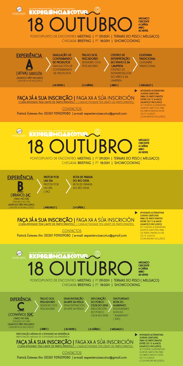 Cada paquete de actividades inclúe accións de balde e outras de pago. Para obter máis información, pode consultar a páxina en Facebook de Experiencia Ecotur e realizar as inscricións na localización web: http://goo.gl/forms/pzjbXAXYd9