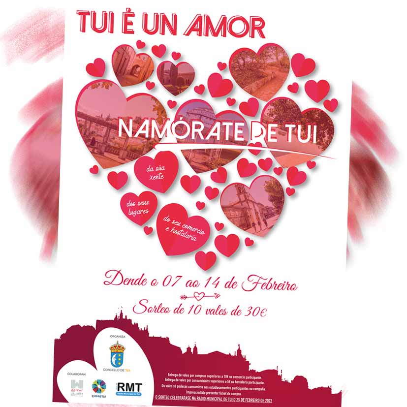 O Concello de Tui recupera con motivo de San Valentín a campaña “Tui é un amor. Namórate de Tui” que se puxo en marcha no ano 2020 con dobre obxectivo. Por unha banda a dinamización comercial da cidade pero tamén a súa promoción turística.